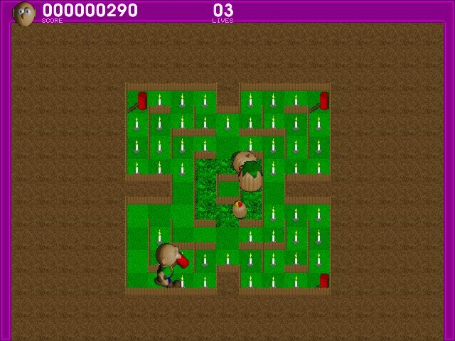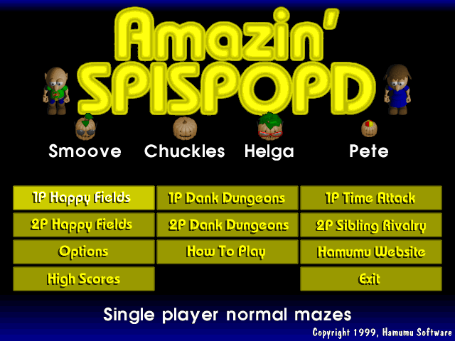 Amazin' SPISPOPD is a spin-off of Smashing Pumpkins into Putrid Debris. It was Jamul's first self-published title. Unlike most Hamumu titles, it features both single player and two player modes (by virtue of sharing the keyboard). The first player is Bouapha, and the second player is Bouaphetta.