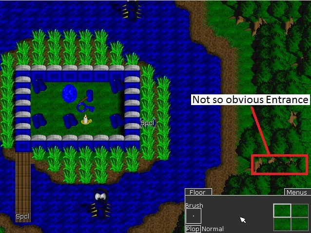 (Not pictured) There are Machetes on the left and right ends of the pond, which you will need to use to chop down the grass to the Blue Tile Switch to gain access to the contents of the temple, which includes the Blue Key.