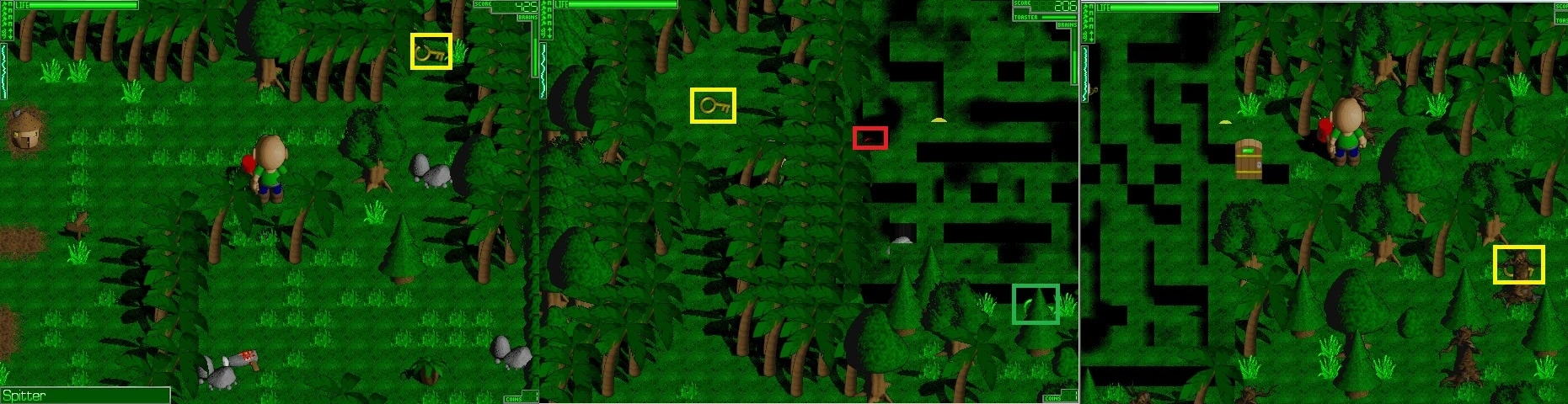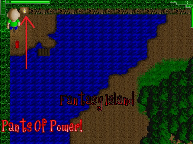 Once in the Forest area,make sure to search carefully for the Brains, Candles and Hammer powerups in that area, before proceeding to the next area, a Watery Rafting Island area.